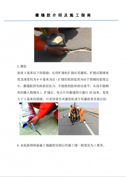 施工工藝: 準(zhǔn)備工作一清縫一工人拌料一人工刮涂一次一固化一二次刮涂一固化一三次刮涂一固化一放開交通(固化時(shí)間15~20min).